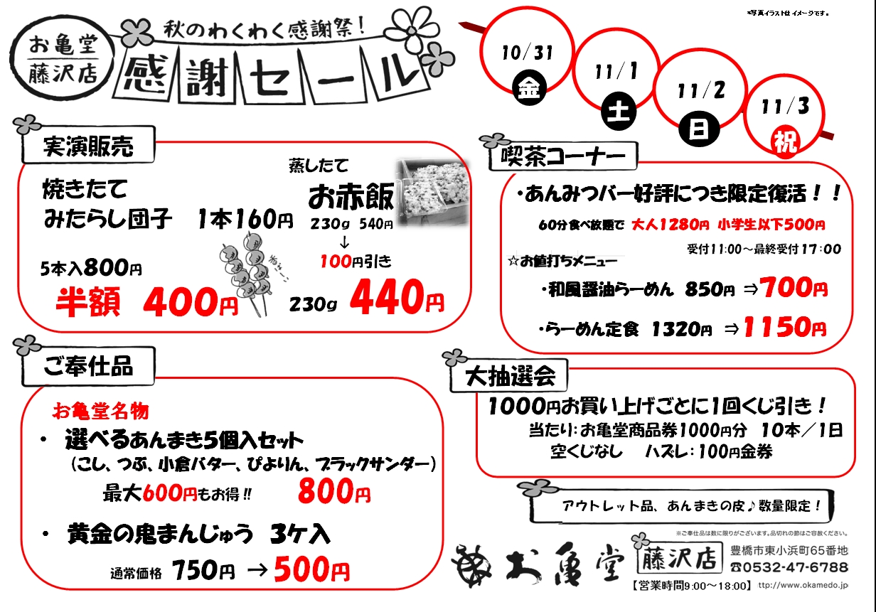 愛知県三河地方で70年以上愛される老舗和菓子店・株式会社お亀堂(本社:愛知県豊橋市/代表取締役:森貴比古)は、藤沢店にて10月31日(金)〜11月3日(月祝)の4日間、「感謝セール」を開催します。